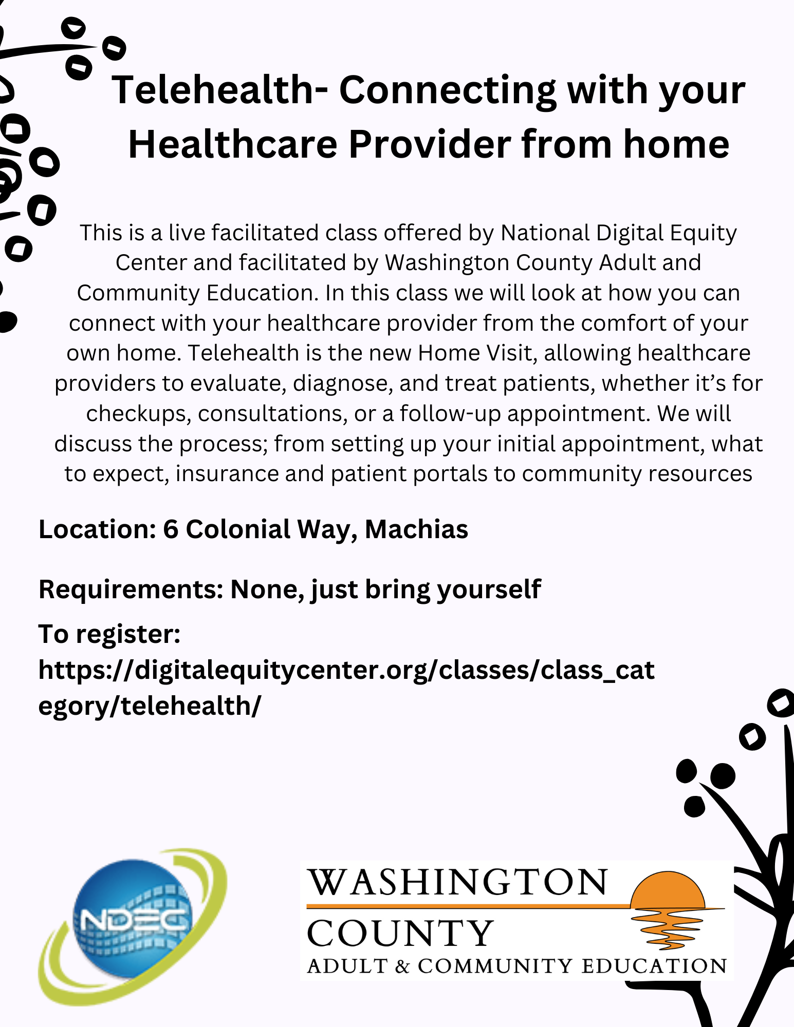 The National Digital Equity Center is offering a live class on telehealth — how you can connect with your healthcare provider from the comfort of you own home — on May 11th from 12:30 — 1:30 pm. Washington County Adult & Community Education will facilitate this class at their training center at 6 Colonial Way, Machias. There are 5 spaces left — register now. See flyer for details.
