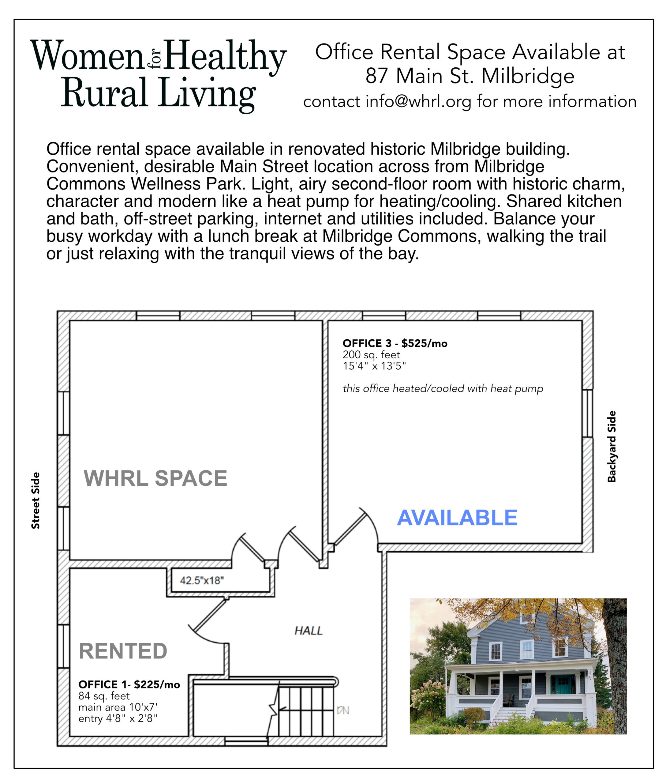 Women for Healthy Rural Living in Milbridge has an office available for rent beginning November 1, 2025. This light, airy, second-floor 200 sq ft office comes with its own heat pump. Shared kitchen and bath, off-street parking, internet, and all utilities included – $525/month (see graphic) Contact Susan at susan@whrl.org with inquiries.