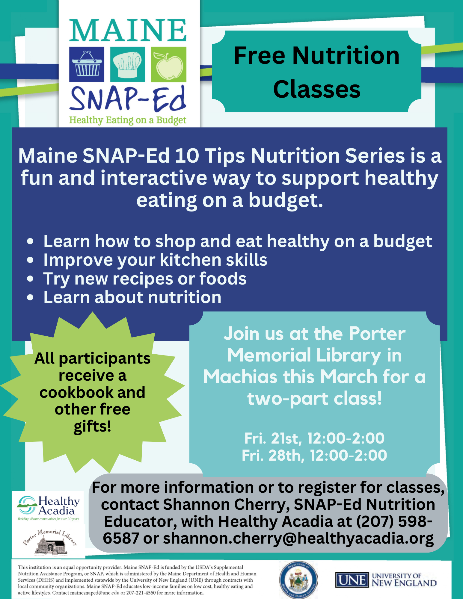 Maine SNAP Ed Nutrition Educator, Shannon Cherry, is presenting a 10 Tips Nutrition series at Porter Memorial Library in Machias. This is a series of two free classes from 12 Noon — 2 pm on Friday, March 21st and Friday, March 28th. Download a flyer for more information.