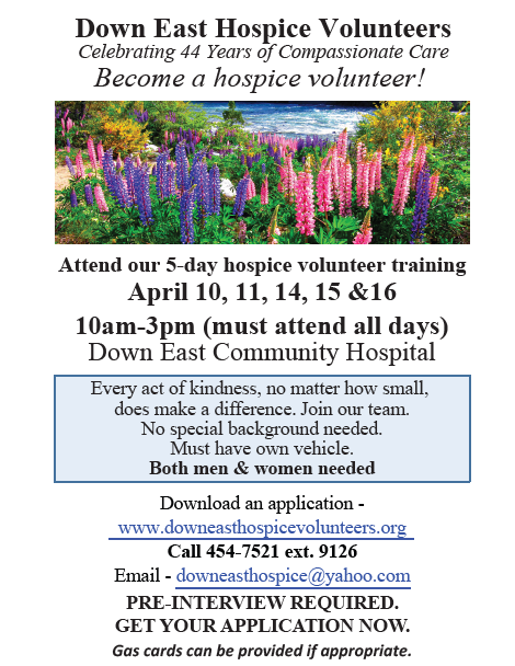 Save the date of May 17th for the Beth C. Wright Cancer Research Center’s Walk for Life. This year is the 25th anniversary of Walk for Life. 1 mile, 2 mile, or 5 mile walk/run. 9 am — 2 pm in Addison, including family fun, children’s activities, Corn Hole, other games, lobster raffle and a BBQ lunch. Contact the Center at 207-664-0339 or info@bethwrightcancercenter.org for details.