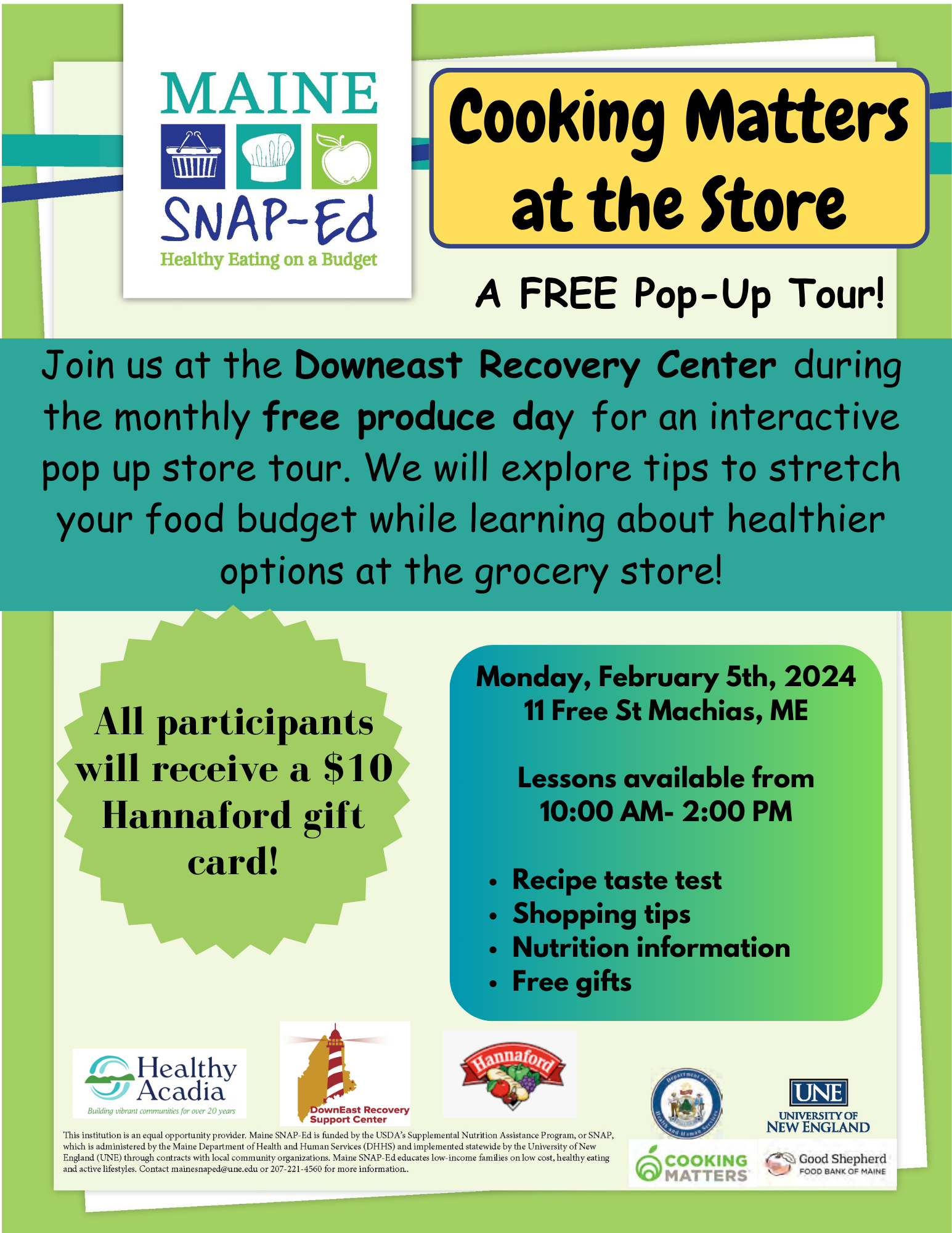 Join SNAP Ed Nutrition Educator, Shannon Cherry, at the Downeast Recovery Center during the monthly free produce day (Monday, February 5th) for an interactive pop-up store tour between 10 am and 2 pm. We will explore tips to stretch your food budget while learning about healthier options at the grocery store. All participants will receive a $10 Hannaford card. Download a flyer to share.