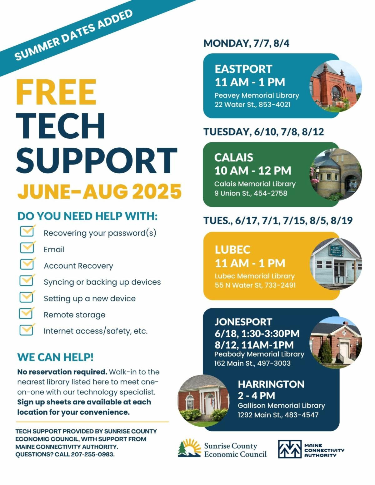 Sunrise County Economic Council with support from Maine Connectivity Authority brings you free tech support June through August at libraries in Eastport, Calais, Lubec, Jonesport, and Harrington. Download the schedule.